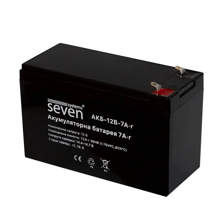 Акумуляторна батарея 12В / 7Аг. ХАРАКТЕРИСТИКИ: Виробник SEVEN Systems. Країна виробник- Китай. Тип монтажу-Настінний. Індикація-Світлова. Додатковий акумулятор-Так. Гарантійний термін-18 міс. Матеріал корпусу-Пластик. Тип акумулятора GM. Струм заряду-1.4 А. Частота струму-50 Гц. Мінімальна вхідна напруга100 В. Максимальна вхідна напруга240 В. Вихідна напруга-12 В. Вихідна потужність- 60 Вт. Максимальна потужність-60 Вт. Час зарядки-9 година. Час роботи при повному навантаженні-75 хв. Напруга акумулятору-12 В. Габаритні розміри: Довжина-282 мм. Ширина-221 мм.Висота-110 мм. Вага-3.28 кг. Захист-Автоматичне регулювання напруги-Так. Захист від перевантаження-Так. Захист від короткого замикання-Так. Захист від перегріву- Так. Тип корпусу-Негерметичний. Тип виробуББЖ + АКБ.