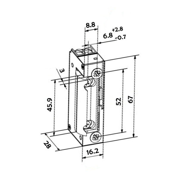 Характеристики: - 3000 Ньютонів міцність проти зламу; - від -20°C + 50°C температура довкіллля; - 67х16.2х28 мм розміри корпусу В х Т х Гл; - радіяльний зачіпний гак; - зачіпний гак регульований відносно корпусу; - 3,5 мм розмах регуляції зачіпного гака; - ZAMAK матеріял зачіпного гака; - нікель покриття зачіпного гака; - 200 000 циклів тестовано електрокотушку; - EN 14846-2010 (3C7---); тип праці: без напруги у стані розблоковано