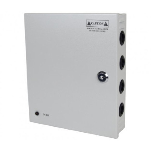 Блок питания импульсный, выход: +11-14 В / 10 А, клеммник; вход: ~220...240 В, клеммник; металлический корпус с крышкой и замком. 9 каналов нагрузки, Защита от: перегрузки, короткого замыкания, скачков напряжения, превышения и понижения входного напряжения, отдельные предохранители по 1.1 А на каждый канал. Размеры 235 х 205 х 53 мм.